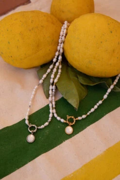 Indulge in the elegance of the Amalfi Pearl Necklace. Inspired by the soft colors of the Amalfi Coast, these pearls capture the timeless beauty of the coast. The pearls subtly enhance your outfit, while the design echoes Mediterranean architecture. A piece that delicately accentuates your individuality. Available in Silver & Gold.