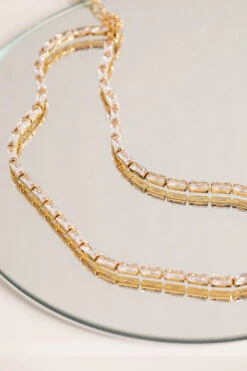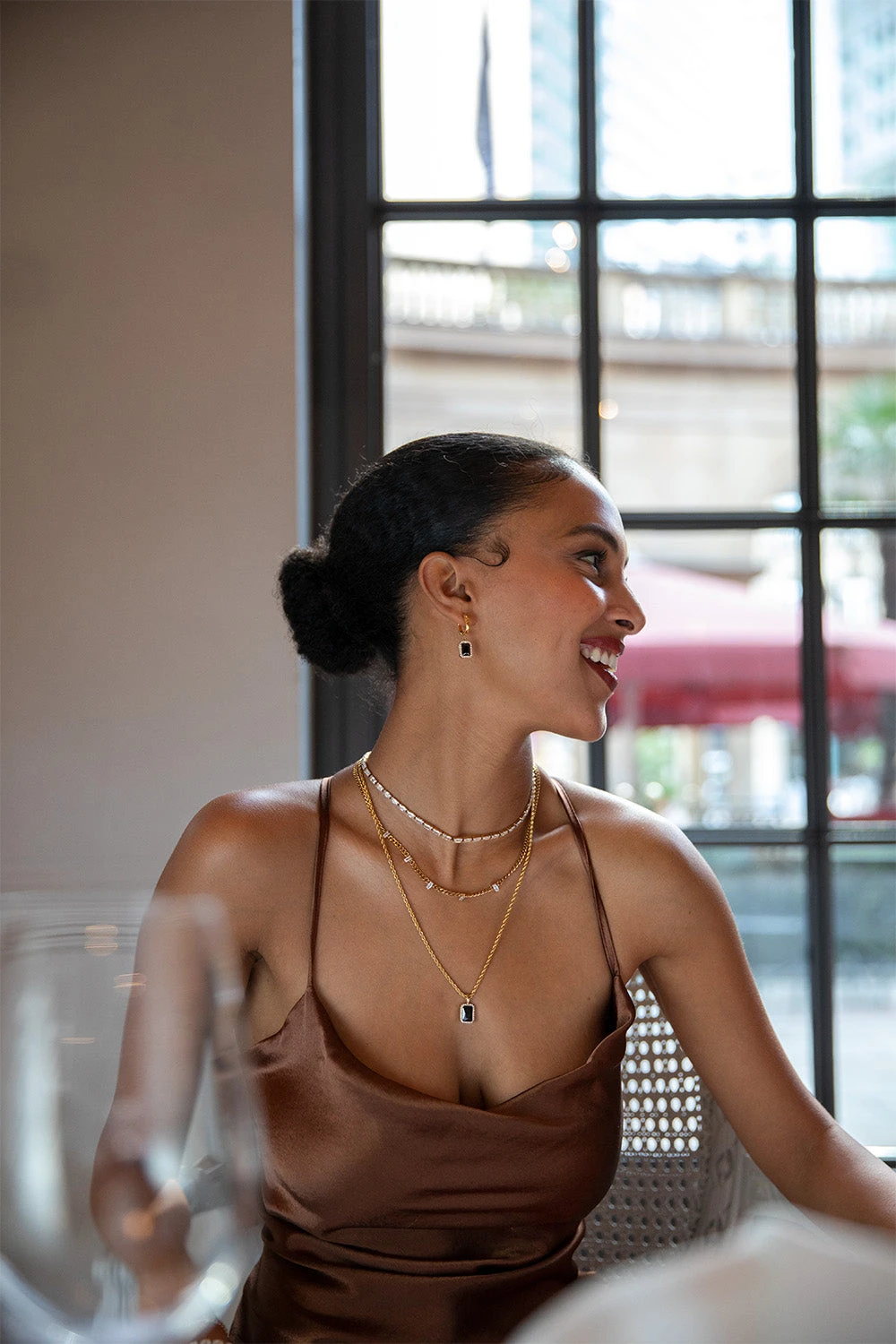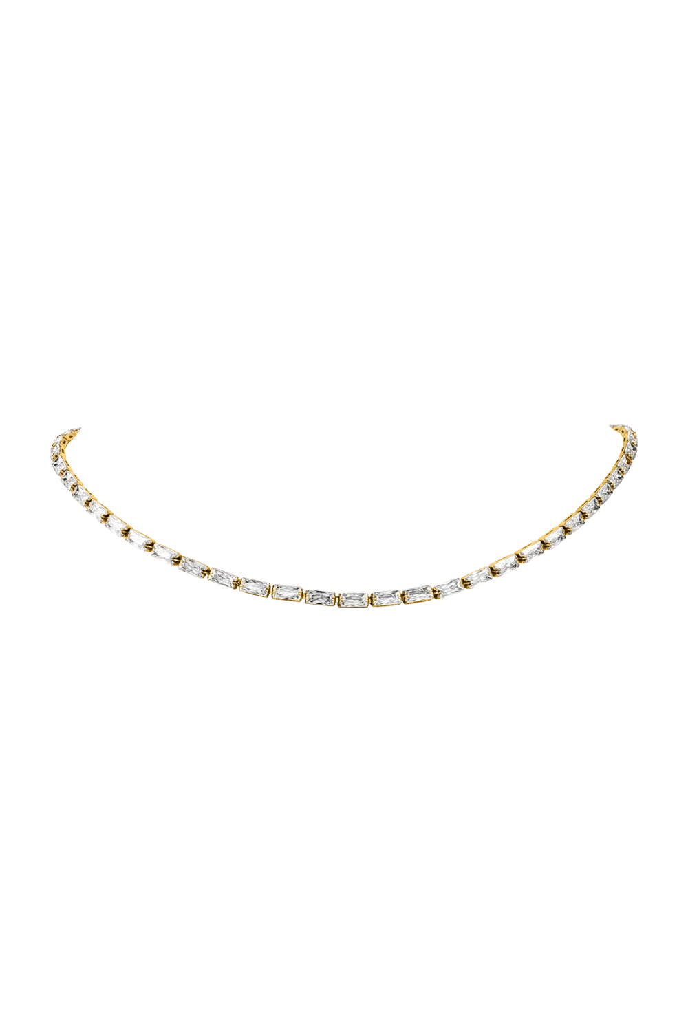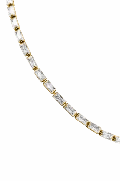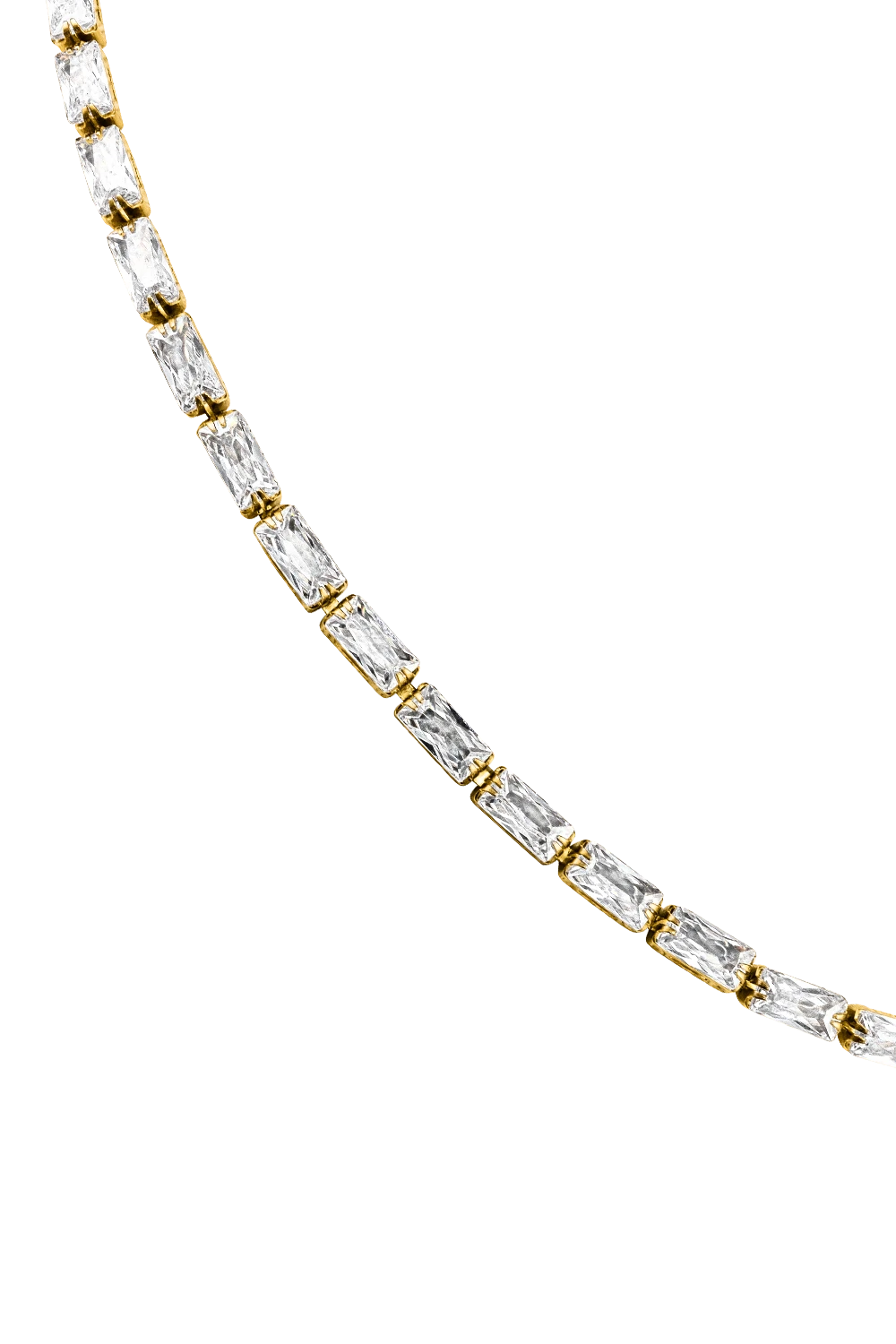 Discover our Baguette Tennis Necklace – a versatile must-have for your everyday jewelry collection! It wraps elegantly around your neck, and its tiny cubic zirconia stones add little highlights to your neckline. Love to create your perfect layering? Pair it with longer necklaces like the Baguette Stone Necklace or the Curb Baguette Necklace from the Shine Bright Collection. Made from recycled stainless steel with a 14K gold or ion silver plating.