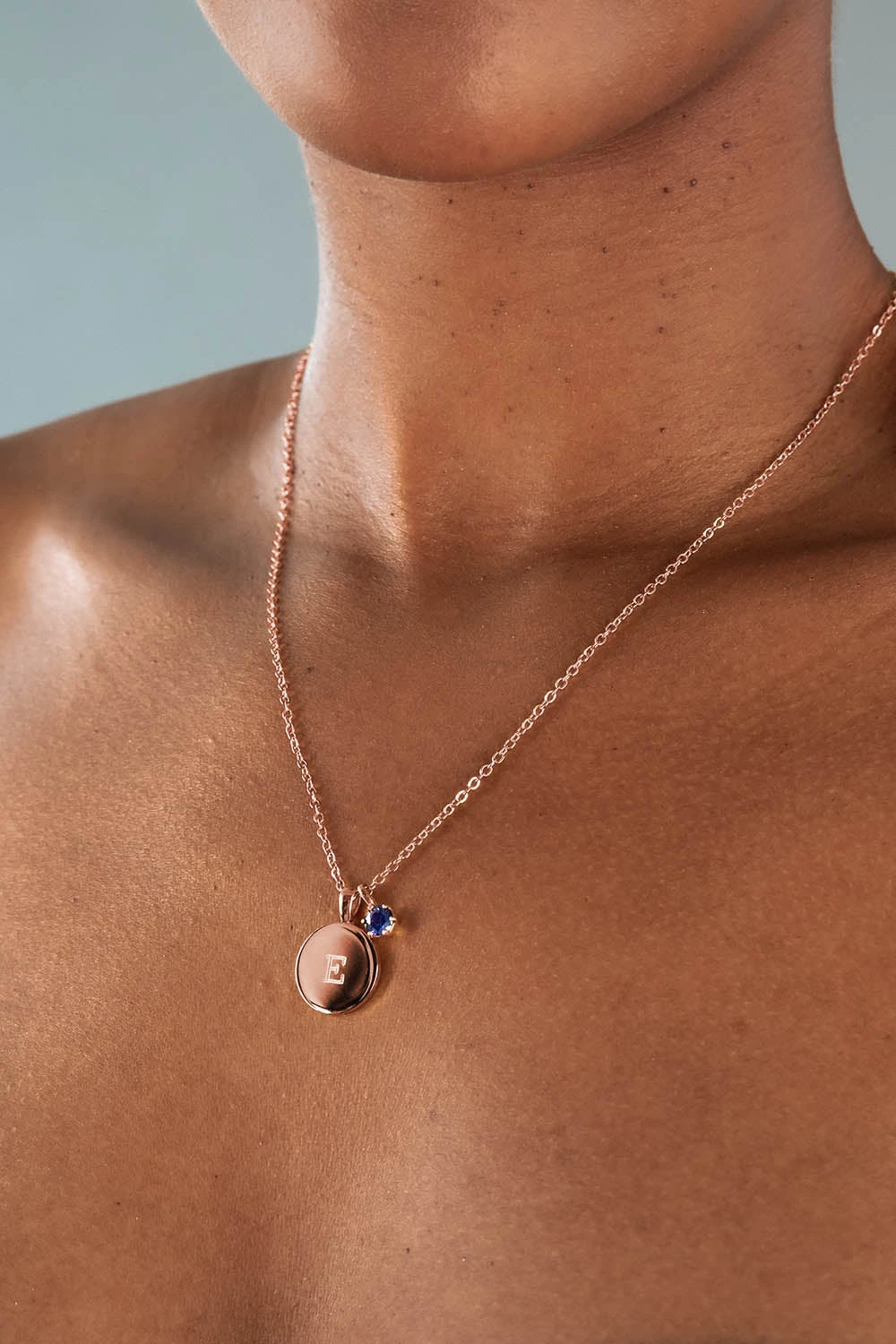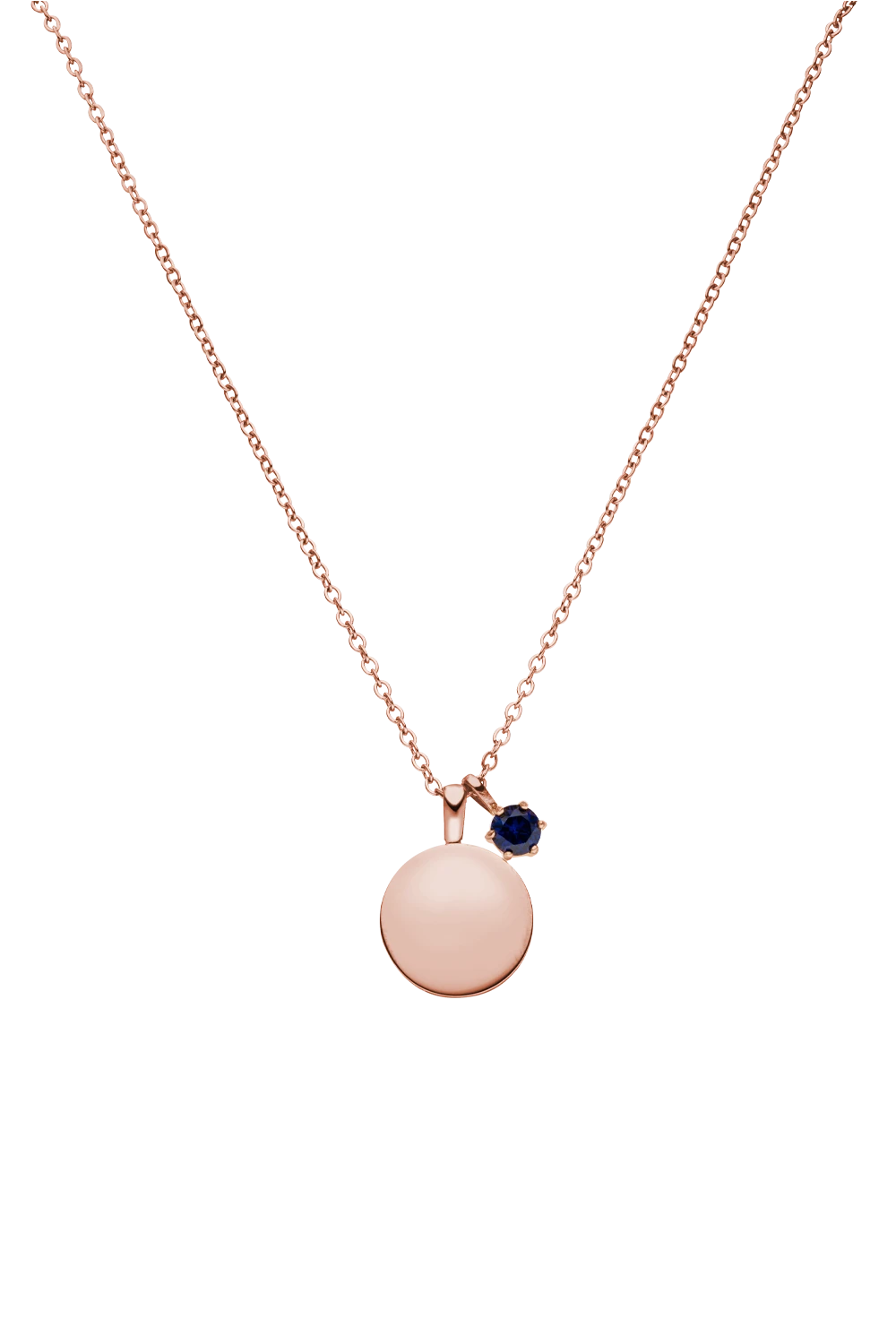 Say hello to our beautiful Birthstone Necklace, a stunning piece that comes with a rose golden plate and a coloured stone representing your birth month. September stands for wisdom and calmness and is represented by a dark blue zirconia stone. Visit our website paul-valentine.com to add an engraving with your name, initials, or a number on the plate and give this necklace even more meaning (up to 4 characters)! Made from recycled stainless steel and 14k rose gold plating.