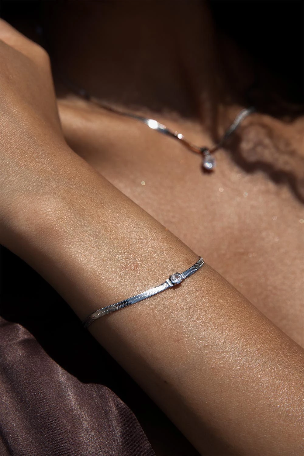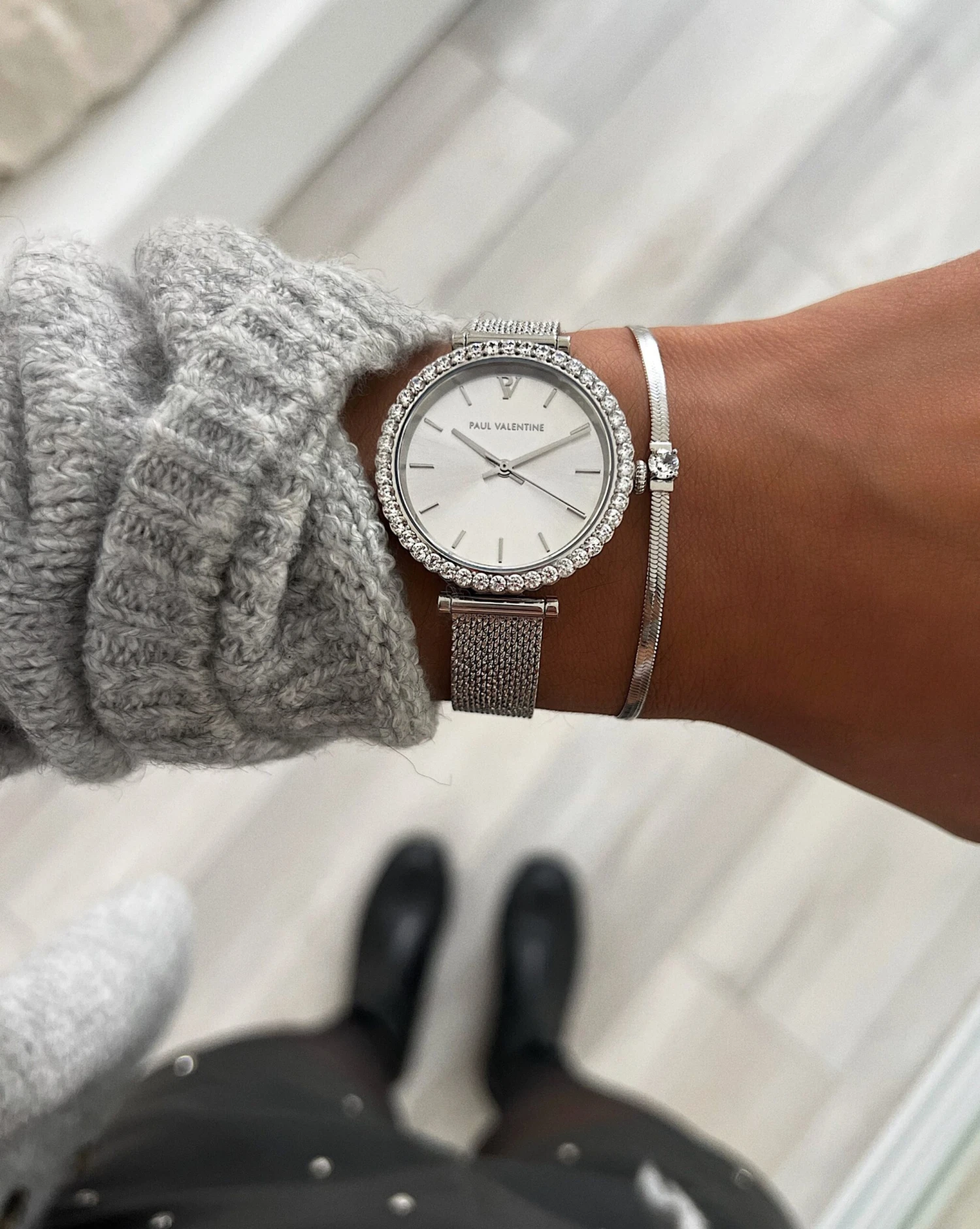 Meet the Brilliant Sleek Bracelet: an ultra-elegant piece that will drape beautifully around your wrist and leave a feeling of pure luxury on your skin. A small delicate zirconia stone adds a sparkling highlight. Why not pair it with your favourite PAUL VALENTINE watch? Create a stack that will make you shine all day, every day! Available in silver and gold.
