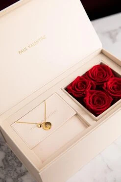 The Engravable Heart Rose Box features a beautiful necklace with a small heart pendant and a larger pendant with space to engrave a special meaning – a perfect gift to share your story with someone special! Plus, your gift comes with four natural Infinity Roses, which last up to 2 years without water. Infinity Roses are real roses that have been gently preserved. As this is a natural product and each rose box is unique, the colour and shape of the roses may vary slightly. Available in silver and with 14K gold plating.