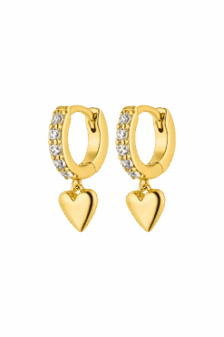 Treat yourself to this special pair of Heart Huggies: The elegant earrings are adorned with small sparkling zirconia stones and a small heart pendant with a beautiful organic shape adding subtle shine. This handmade staple will last a lifetime and give your style a dash of luxury. Available in silver and 14k gold plating.