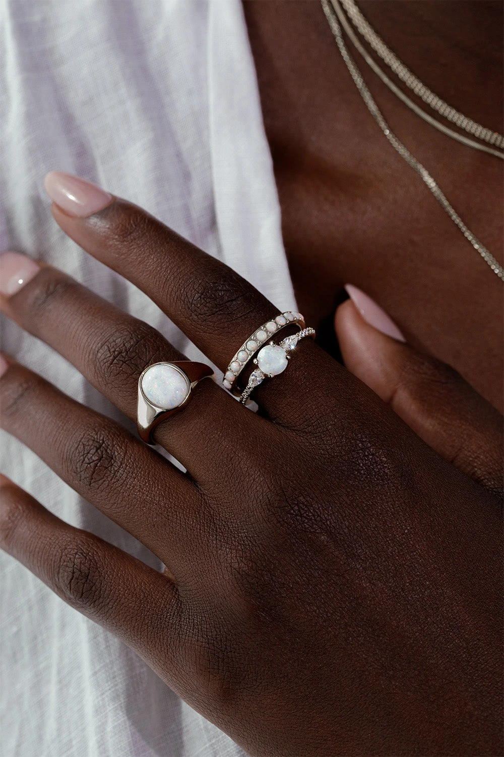 Meet our new favorite ring lined with delicate opal stones: the Opal Dream Ring. The beauty lies in its simplicity, the elegance in its daintiness. If this one doesn’t make for a perfect stack, we don’t know which one will! The opal stands for hope, love and passion. The ideal piece to remind yourself of your inner beauty and power. Available in 14k gold plated and silver.